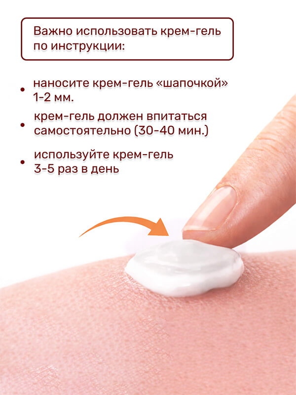 - 1. Крем-гель от следов после прыщей наносится точечно, только на проблемные участки 2-5 раз в день. Количество наносимого средства зависит от степени поражения: тонким слоем при незначительном или более толстым при выраженном.