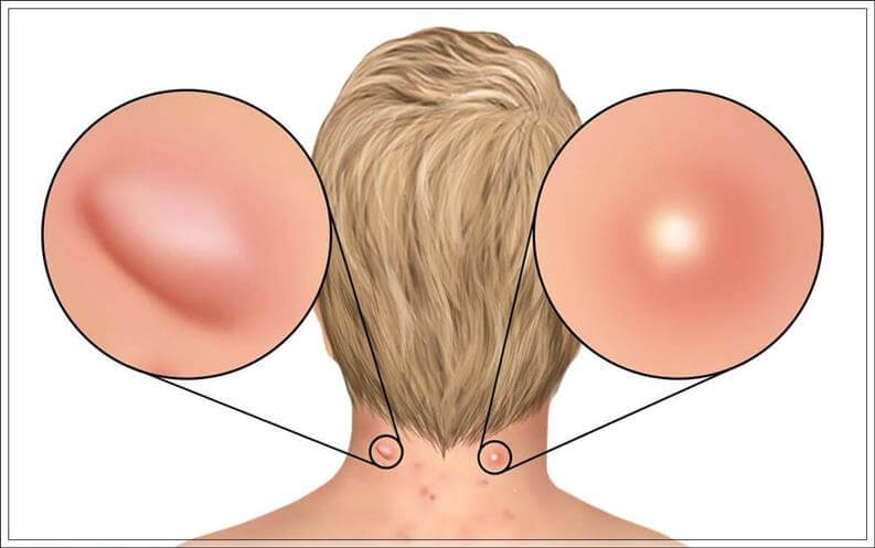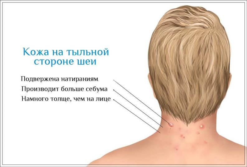 Из-за этого кожа тыльной части шеи больше подвержена повреждениям, таким как кисты и узлы, или крупные белые угри.